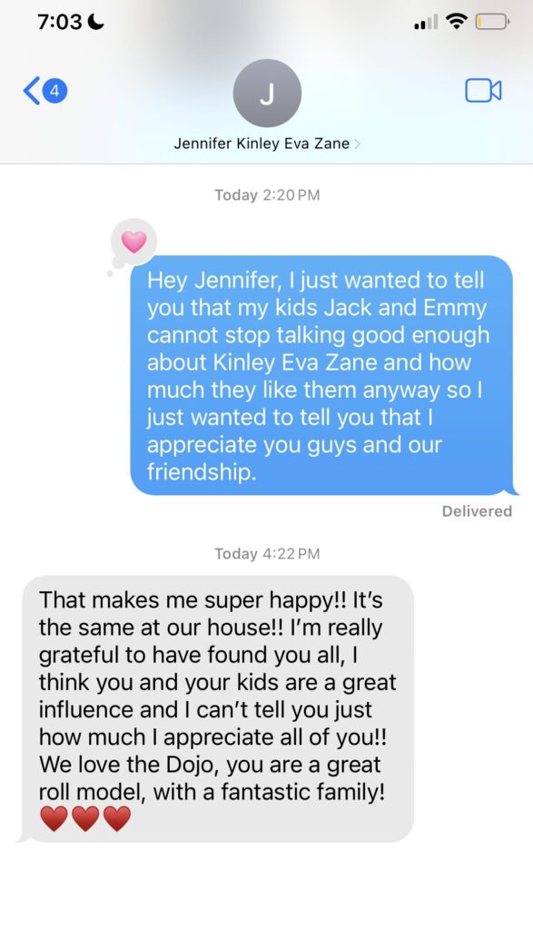 For example, I just wrote to Jennifer (her family isn’t homeschooled) and received a really kind compliment from her — and I wanted to share it because it perfectly shows how friendships at the dojo extend beyond any single background or schedule.
